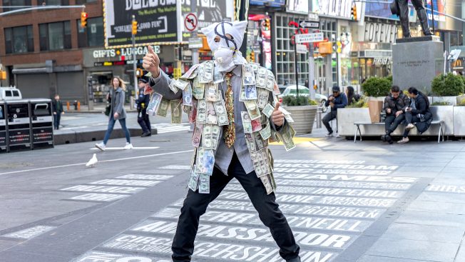 第三场街头艺术主题则为“政金国际/阵惊国际”,他了解疫情下国家、地方政府需要大量金钱和支援,疫情也将严重冲击经济体系,“我在身上贴满世界各国纸币,象征这场疫情间各国关系会有所改变,美国两党派也会重新思考、减少政治冲突”。