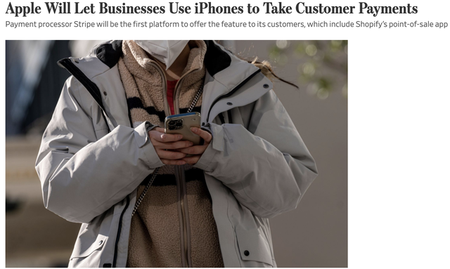 新功能可能会影响Block Inc等公司的业务,该公司为商店和企业制造硬件,允许他们接受非接触式支付。Block的股价在周二的午盘交易中下跌了约1%。