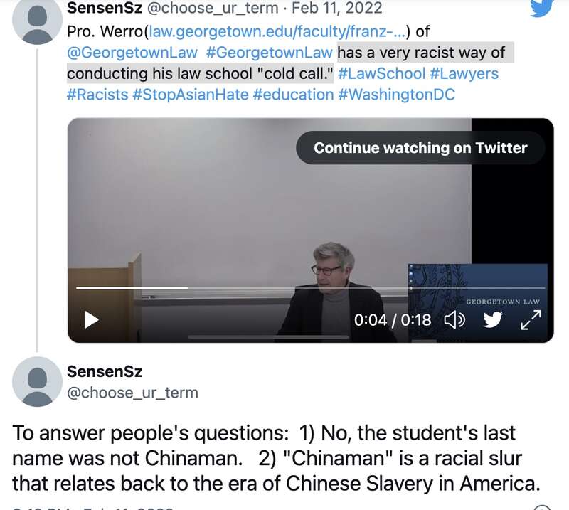 乔治城大学法学院院长崔诺(William Treanor)发表声明说,“当日深夜我才获知事件,牵涉到一名教授在课堂上使用了一个蔑视词汇,而该词汇有贬损伤人的意义。中国佬这个词已有百余年历年,让亚裔觉得受辱。今天我与美国亚太裔法学学生会(APALSA)及乔治城中国法学会的学生代表见面,对此事件仍抱持开放、诚恳对话的态度。”