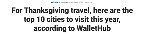 据福克斯商业新闻11月8日报道 对许多人来说,感恩节标志着假日季的开始,数百万美国人计划以某种方式去旅行。WalletHub为那些今年想去一个新地方旅行的人发布了感恩节最值得游览的城市。