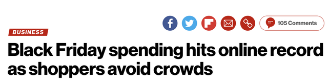 感恩节当天,购物者在网上购买了56亿美元的商品,打破了火鸡日(Turkey Day)的记录,并为黑色星期五打响前站。
