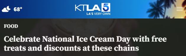 据KTLA 7月19日报道 这个周日,全美各地的连锁店都在庆祝全美冰淇淋日(National Ice Cream Day),顾客可以享受到一些折扣甚至免费的冰淇淋。