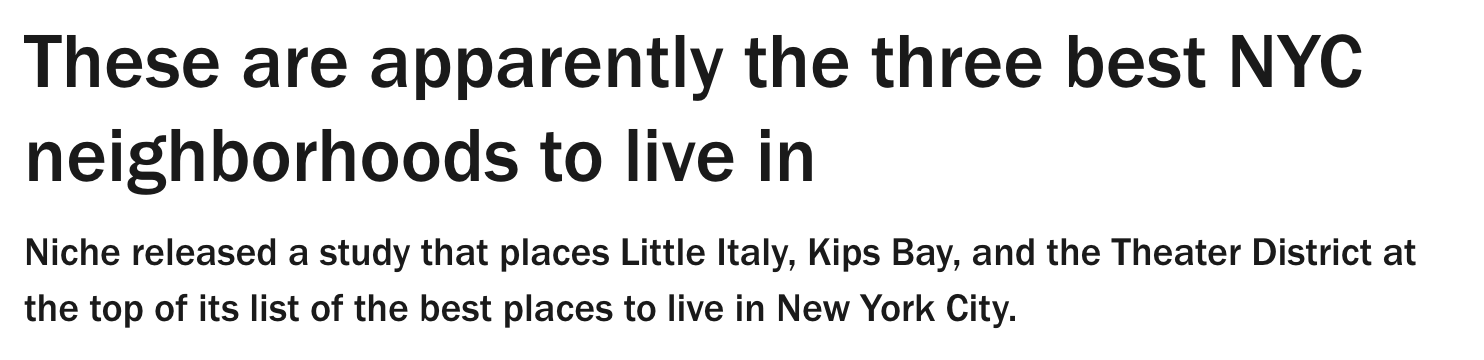 据Timeout 3月27日报道 近日,美国排名与评价平台Niche公布了2025年“纽约市最佳居住社区”榜单,引发不少市民和网友热议。根据这份榜单,位于曼哈顿的Little Italy、Kips Bay、Theater District与Hell’s Kitchen位列前四,让许多熟悉纽约城市格局的人不禁疑问:“我们是不是错过了什么?”