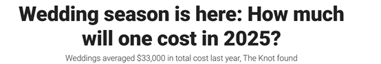 根据婚礼策划公司The Knot的“2025年真实婚礼研究”,去年美国人婚礼的平均总成本为3.3万美元。这比前一年减少了2000美元。